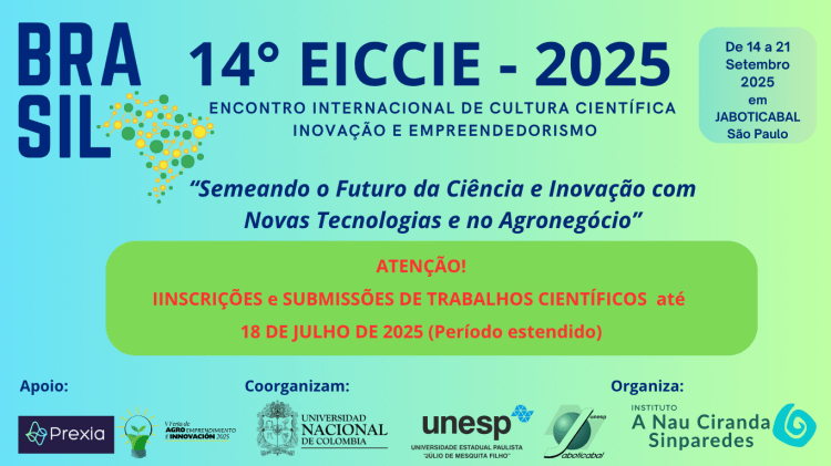 O Instituto A Nau Ciranda Sinparedes – INCSP e a Universidade Estadual Paulista “Júlio de Mesquita Filho” – UNESP – Faculdade de Ciências Agrárias e Veterinárias – FCAV Câmpus Jaboticabal, gostaríamos de convidá-los a conhecerem e participarem do 14° Encontro de Cultura Científica, Inovação e Empreendedorismo EICCIE – FCAV/UNESP- INCSP Brasil 2025 – “Semeando o Futuro da Ciência e Inovação no Agronegócio” que acontecerá de 14 a 21 de setembro em Jaboticabal e Ribeirão Preto, São Paulo.