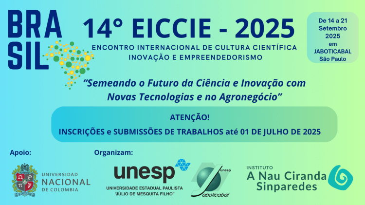 É com grande entusiasmo que apresentamos o segundo número da revista Anais EICCIE, dedicada à publicação dos artigos selecionados para o 14° Encontro Internacional de Cultura Científica, Inovação e Empreendedorismo (EICCIE), realizado entre os dias 14 e 21 de setembro de 2025, nas cidades de Jaboticabal e Ribeirão Preto. Este evento foi fruto de uma parceria sólida entre o INCSP – Instituto A Nau Ciranda Sinparedes, a FCAV – Faculdade de Ciências Agrárias e Veterinárias da UNESP (Universidade Estadual Paulista Júlio de Mesquita Filho) e da Universidad Nacional de Colombia (UNAL), reafirmando o compromisso conjunto de fomentar a ciência, a inovação e o empreendedorismo em escala internacional.