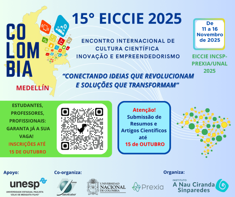 Participe! No 16° EICCIE 2025 COLÔMBIA vocês poderão apresentar seus projetos, trabalhos científicos ou uma ideia inovadora e receber feedback de especialistas, participar de workshops práticos, estabelecer redes de contato com pesquisadores, empreendedores e investidores, e dar o primeiro passo para transformar sua ideia em realidade.